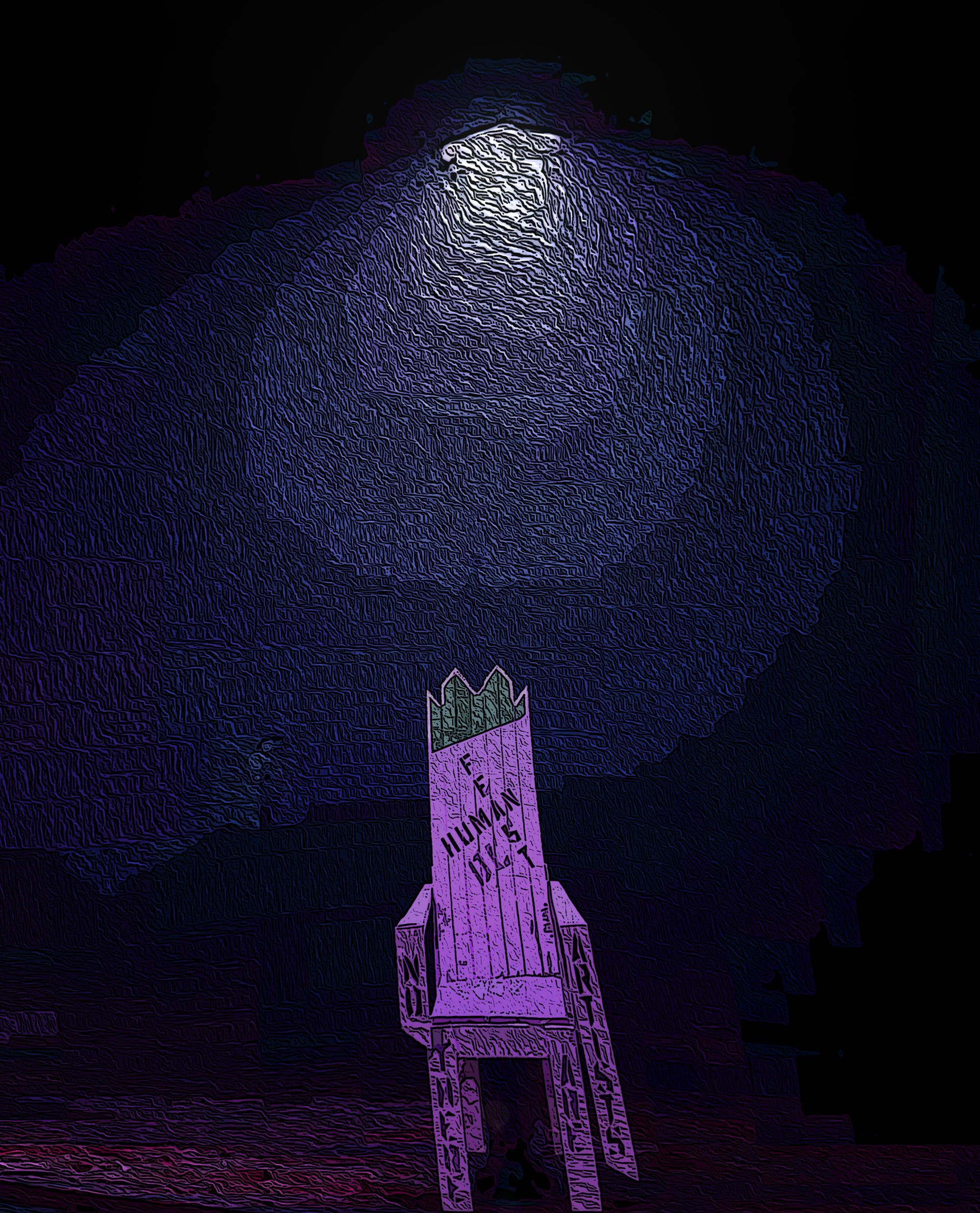 I tend to trust the ones who sit and bounce a leg on the knee of the other. Let’s muse: this is the posture of thinking men and women. The thrones start the session. “We don’t know where they’re from.” “They’re oddly comfortable — for small durations.” “They do feel real.” “The Human Feast, it’s some group.” “I don’t know, honestly.”
